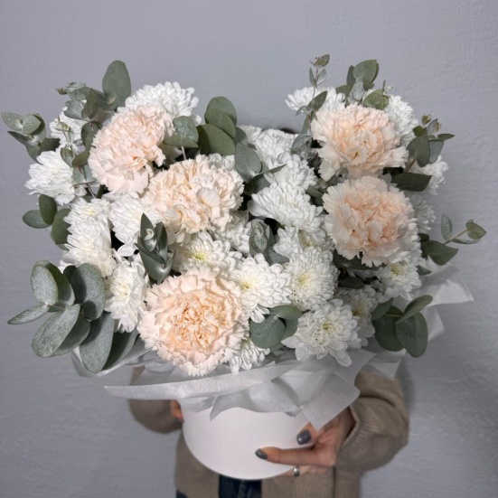 Коробка из кустовых хризантем и диантуса